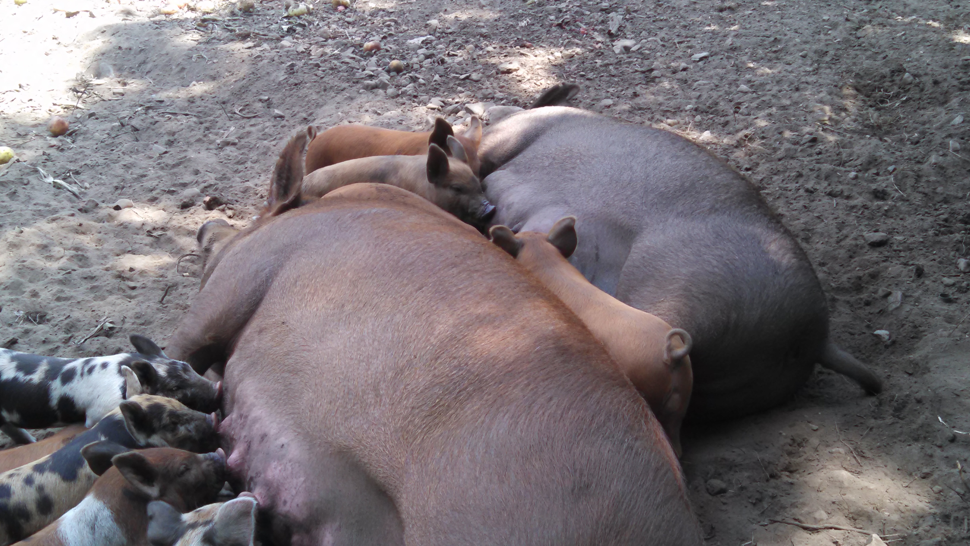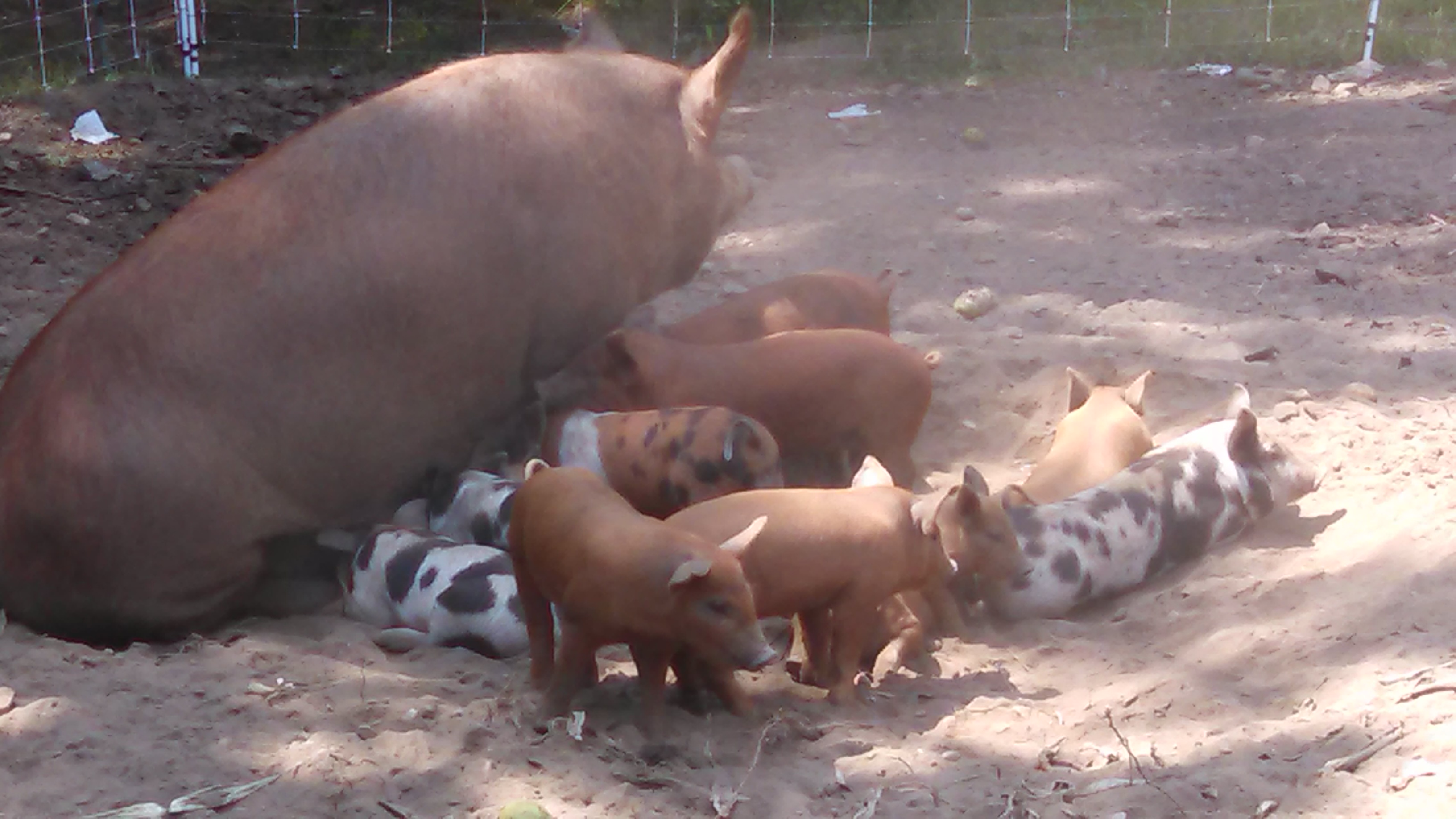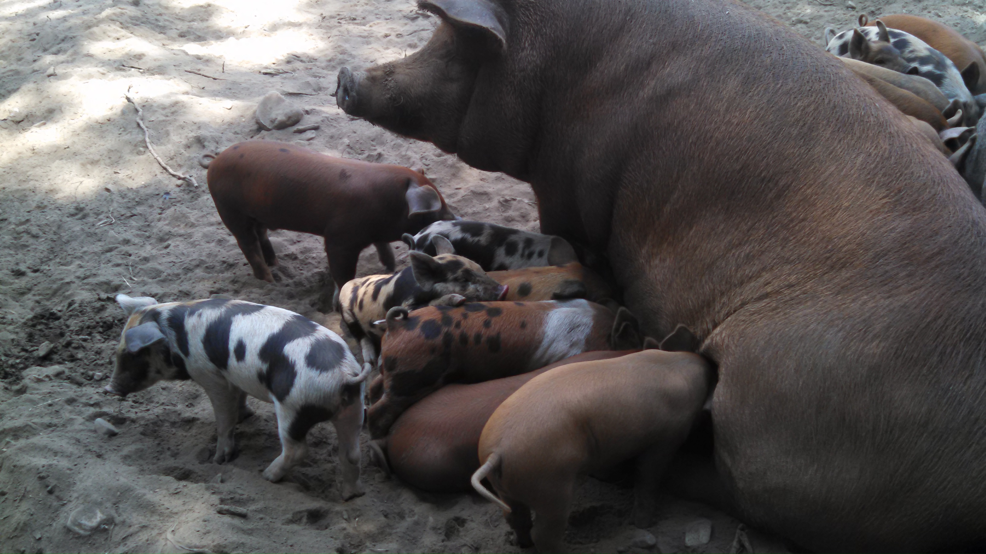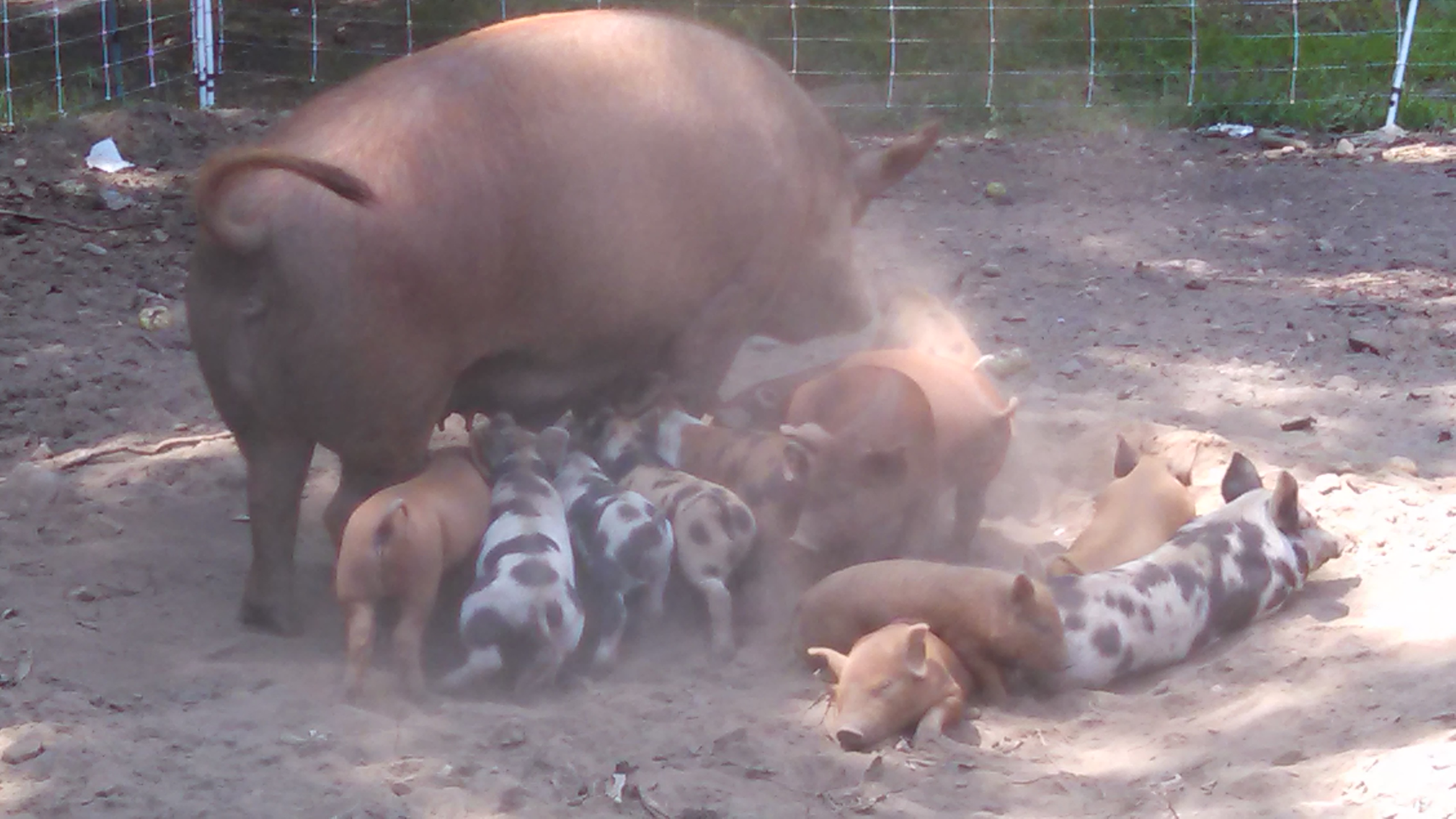 Once piglets are off and running at, ummm birth a few days old, they start to meander on over to wherever there is a good meal. The sows don’t seem to mind and even welcome the respite.
