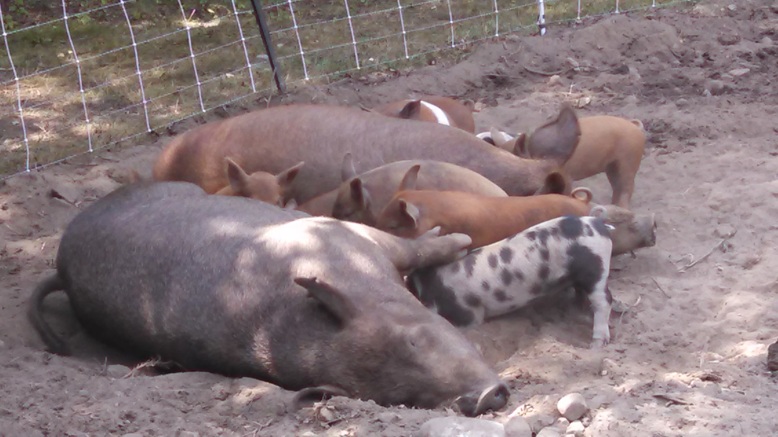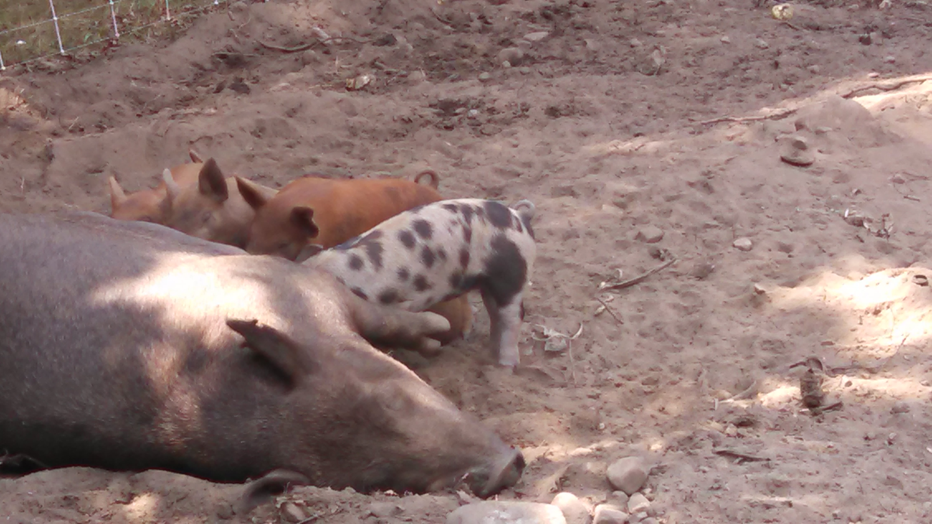Pigs are herd animals. They all have individual personalities, clear likes and dislikes. Yet they do not like to be alone. They will talk to each other, fight with each other even bicker for the favored sleeping position in the hut. They co-sleep and co-parent.