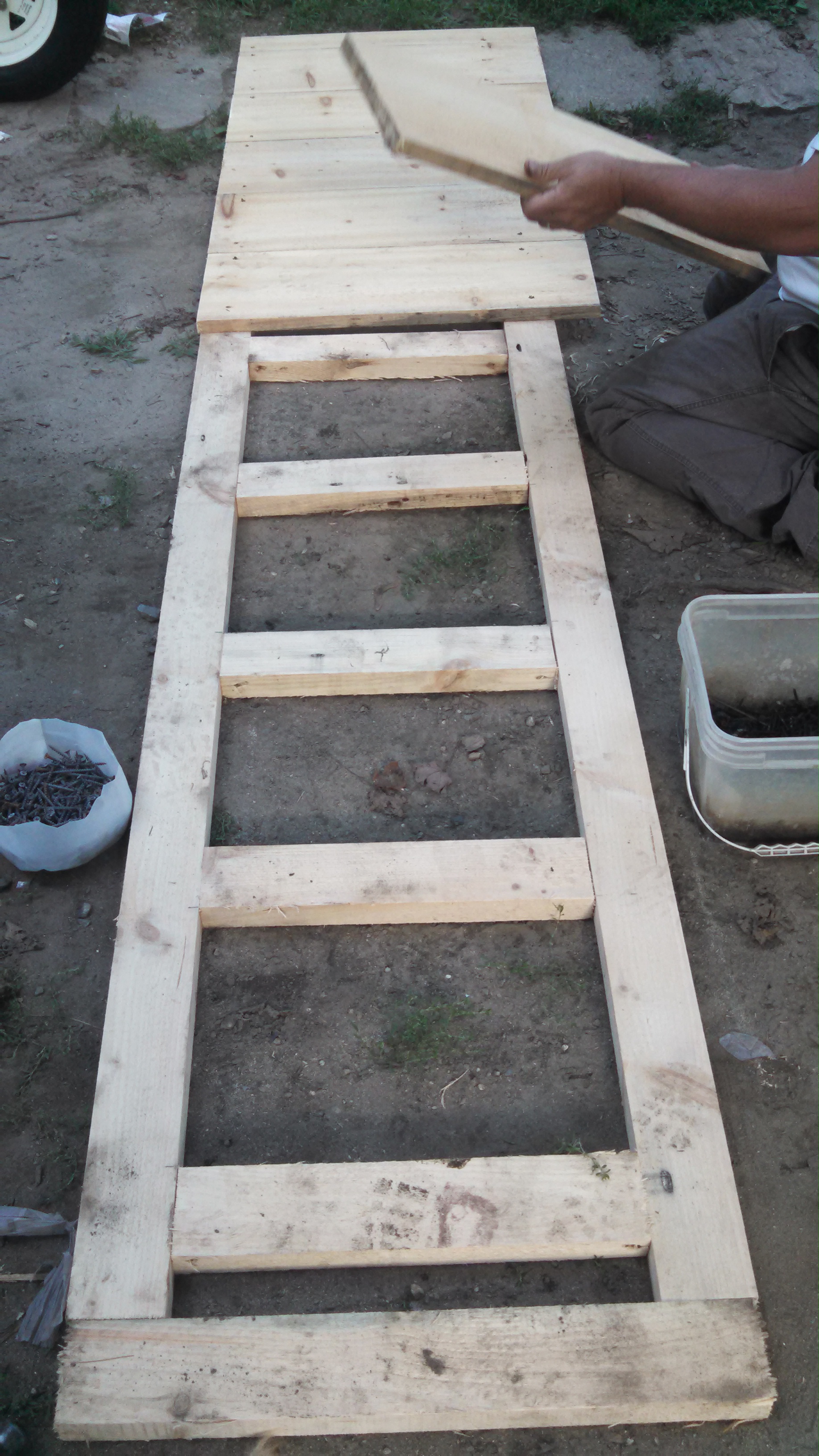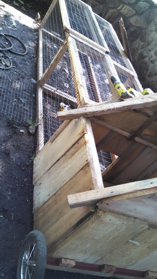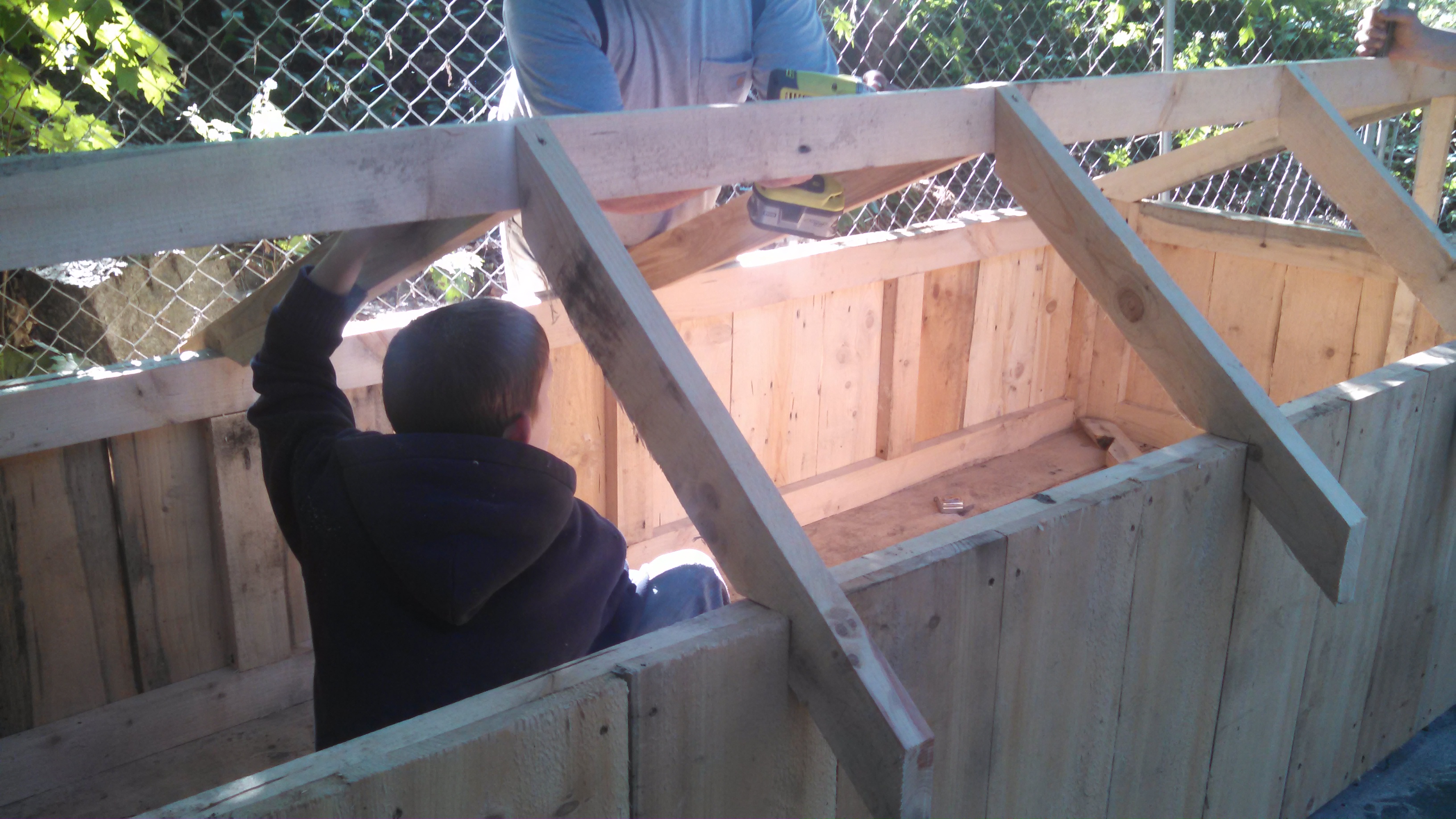 One kid is building a new movable pen for some of his rabbits.