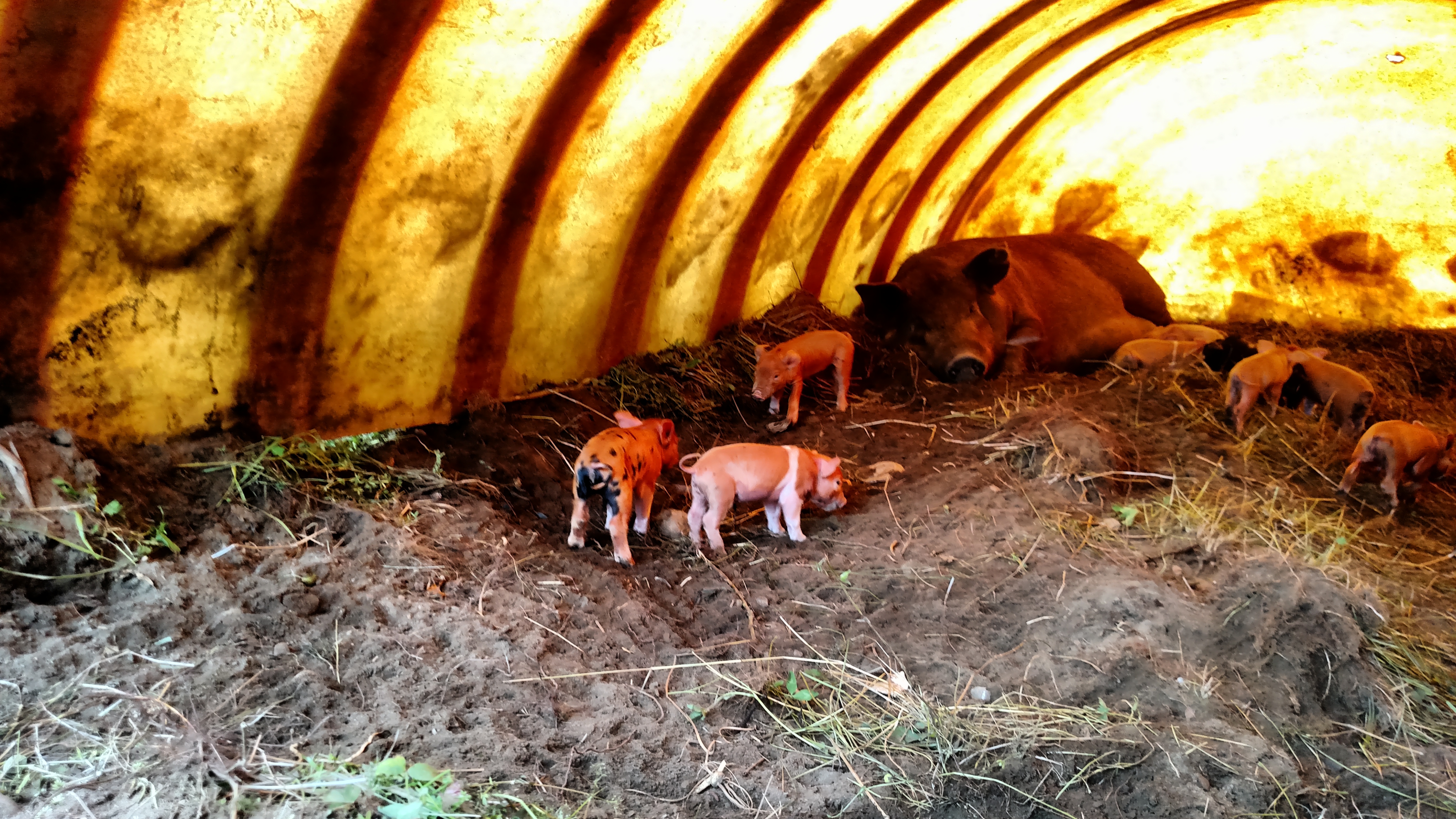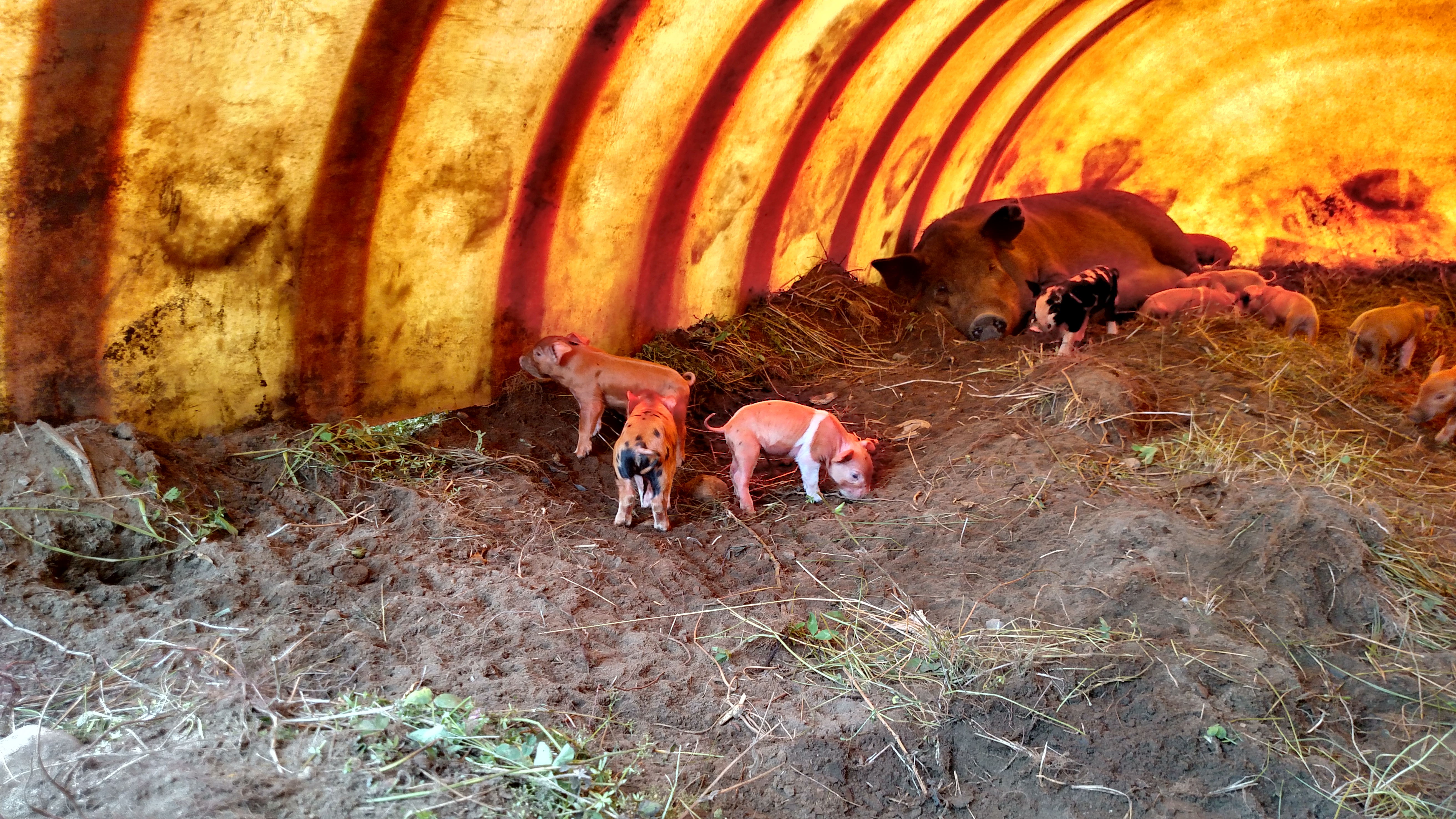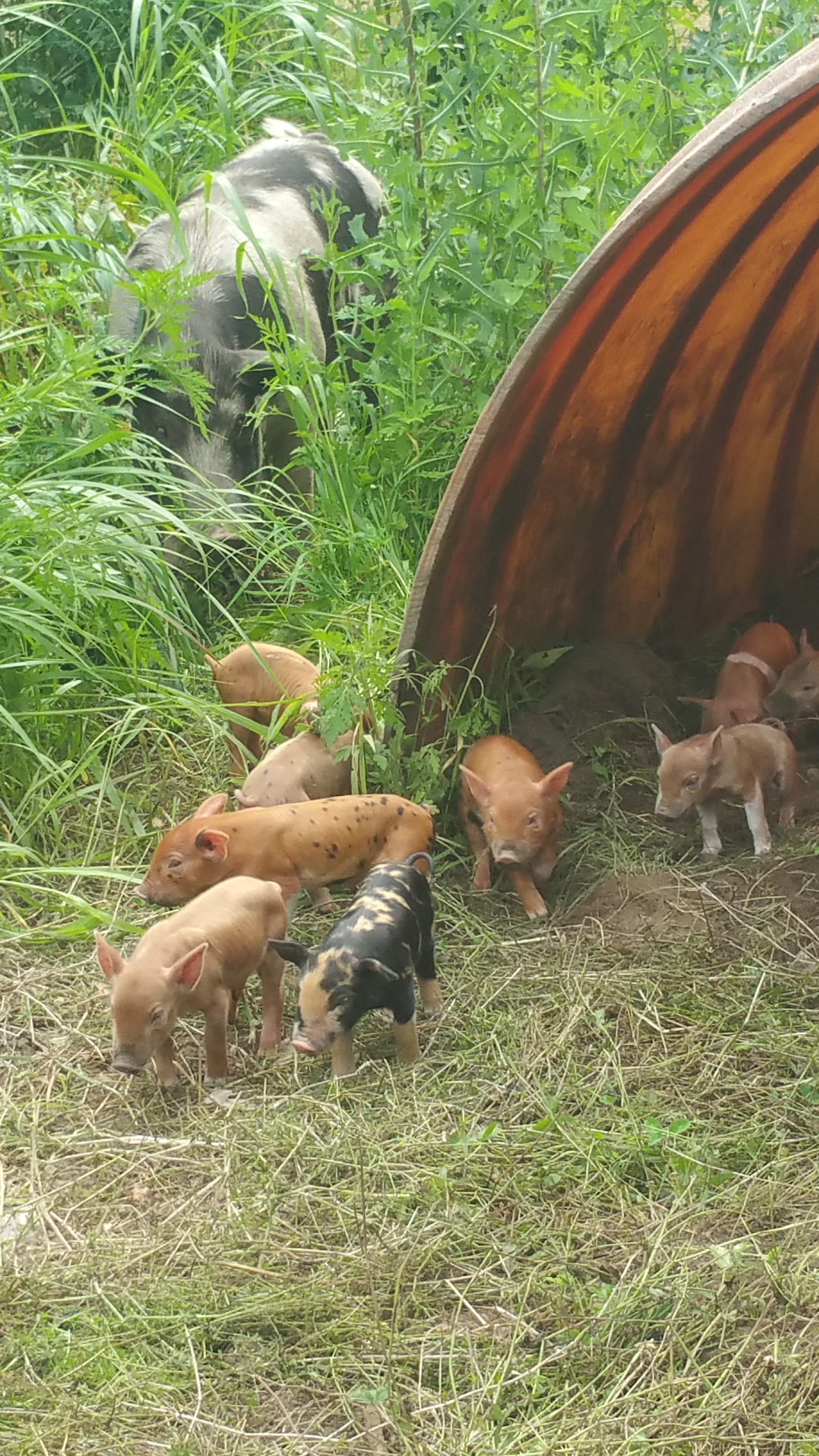We love heritage breeds. We’ve raised other more “modern” breeds but they simply do not thrive living outdoors meandering like heritage breeds do. Side by side, in the same conditions eating the same food, heritage grow better, are happier, healthier and, yes, tastier. Tamworths are our favorite, but we also have a smattering of other breeds in the mix. We currently have one registered Tamworth boar and two registered Tamworth sows. We have one other fully Tam sow, “Ham”, who is the matriarch of our herd, but she is not registered. The others are all mixed breeds which are Tamworths, Large Blacks, Gloucestershire Old Spots, and Hampshires. Sometimes this diversity brings out some pretty cool characteristics at farrowing time. This guy (on the right) with the belt is our current favorite. He’s a Tamworth in the head, Hampshire in the middle, and Old Spot in the rear! We are currently selling piglets, but I am getting fairly attached. This one might hang around for a while…