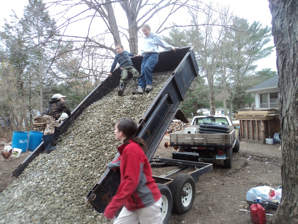 Fast forward to this year.  My dad and a dear friend with a lovely Kubota with a back hoe (ours doesn’t have one) are digging out the driveway, laying down some flat stones and regrading the driveway.  I have high hopes and am looking forward to a winter that I hope is, water in my basement free 🙂