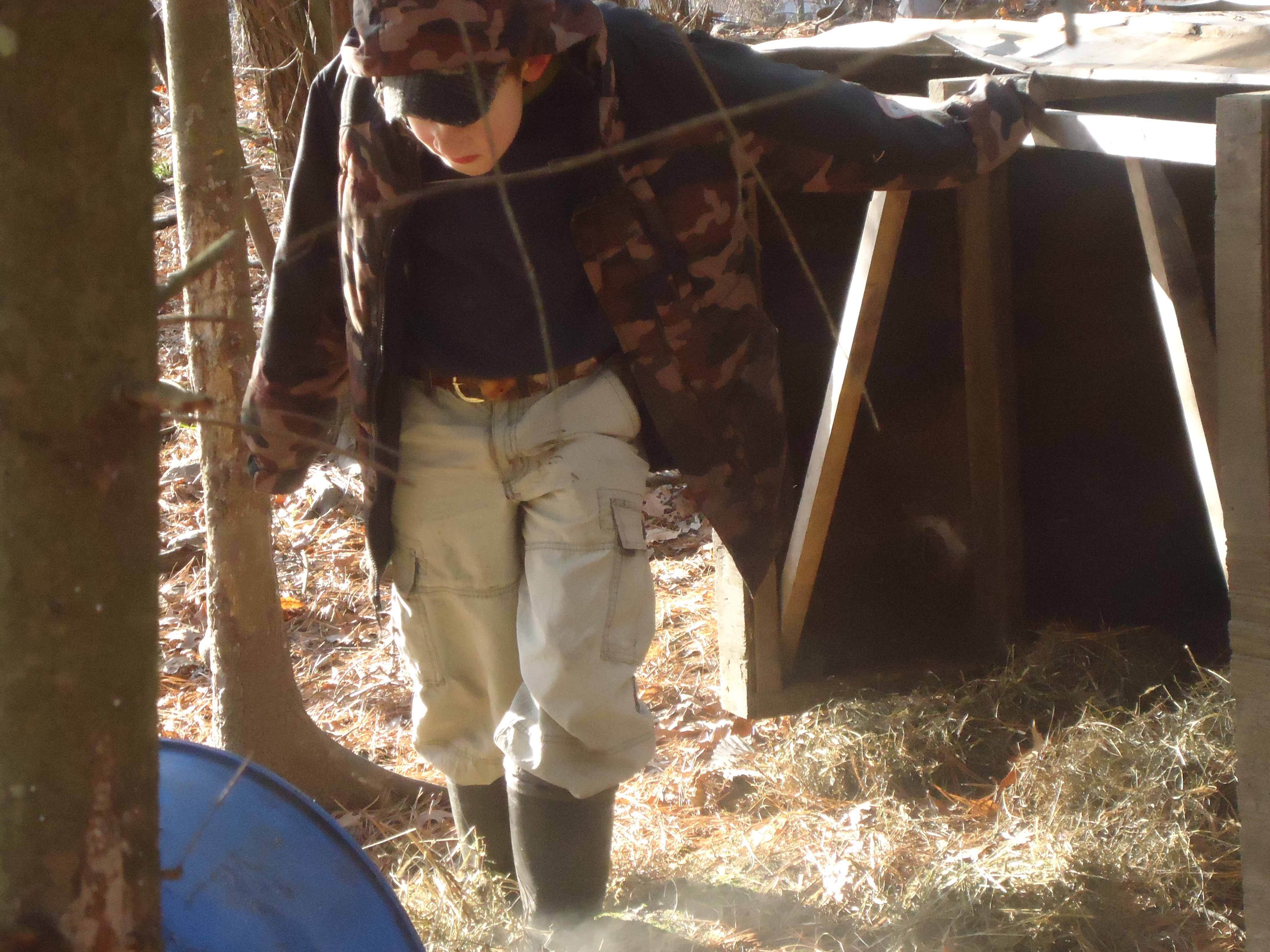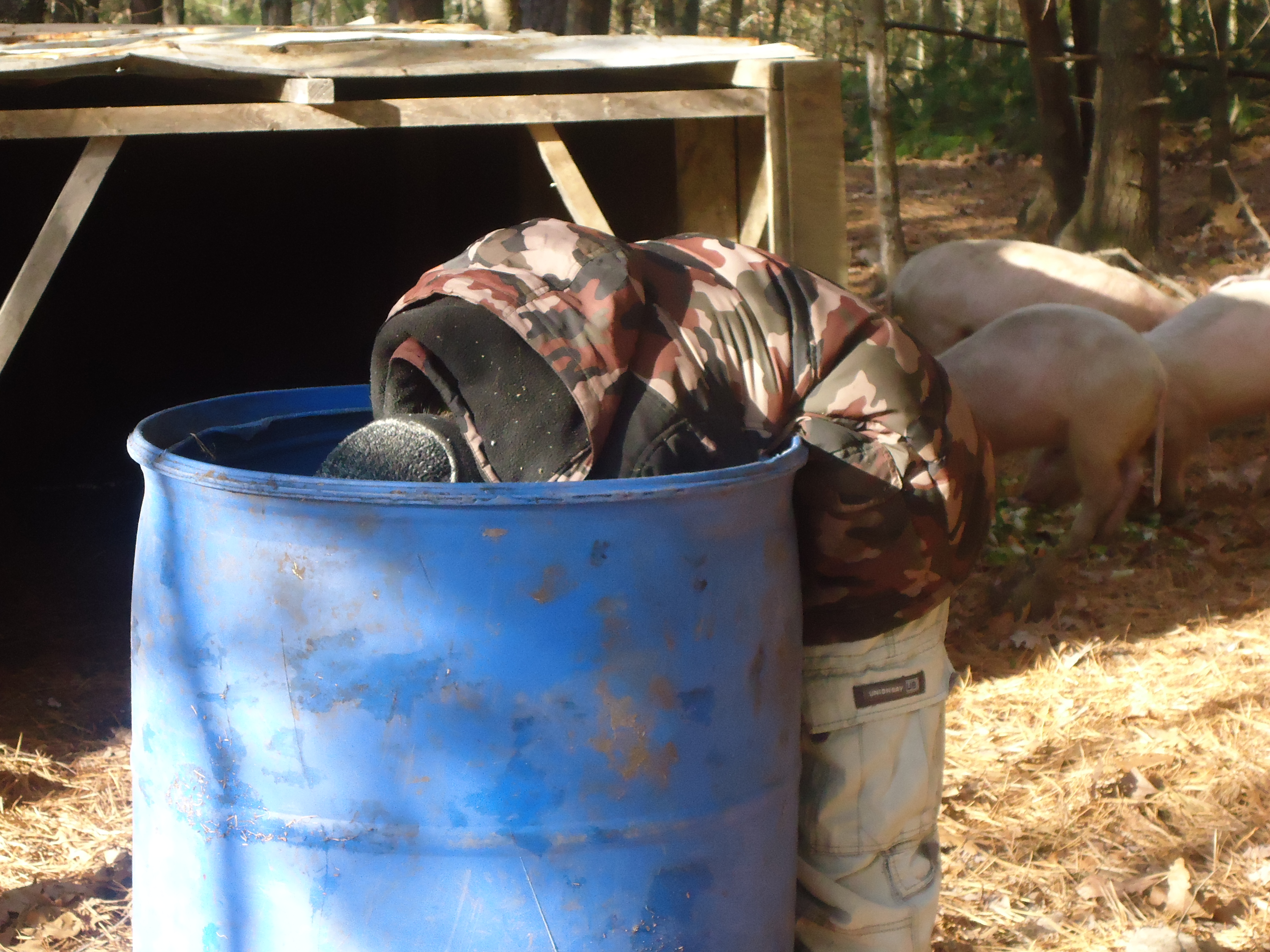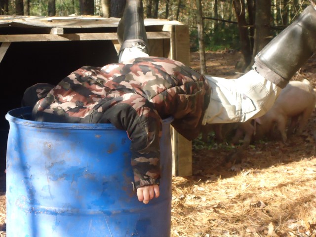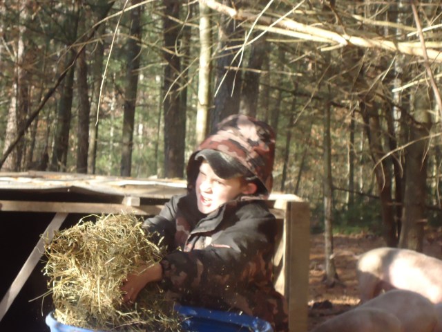 We had a “Pig Moving Day” earlier this week. One of our sons was given the task of bringing some hay down to the new area to put in the shelter…..